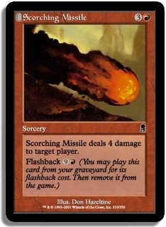 Scorching Missile deals 4 damage to target player. Flashback 9R (You may play this card from your graveyard for its flashback cost. Then remove it from the game.)