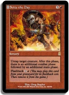 Untap target creature. After this phase, there is an additional combat phase followed by an additional main phase. Flashback 2R (You may play this card from your graveyard for its flashback cost. Then remove it from the game.)