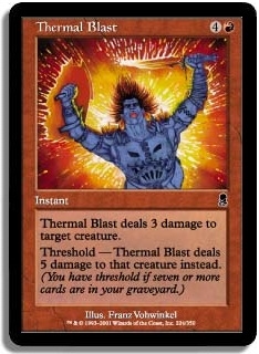 Thermal Blast deals 3 damage to target creature. Threshold - Thermal Blast deals 5 damage to that creature instead. (You have threshold as long as seven or more cards are in your graveyard.)