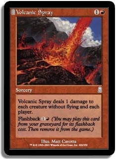 Volcanic Spray deals 1 damage to each creature without flying and each player. Flashback 1R (You may play this card from your graveyard for its flashback cost. Then remove it from the game.)