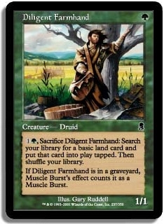 1G, Sacrifice Diligent Farmhand: Search your library for a basic land card, and put that card into play tapped. Then shuffle your library. If Diligent Farmhand is in a graveyard, Muscle Burst's effect counts it as a Muscle Burst.