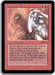 If you choose to block with Ydwen Efreet, flip a coin immediately after defense is announced; opponent calls heads or tails while coin is in the air. If the flip ends up in opponent's favor, Ydwen Efreet cannot block this turn.