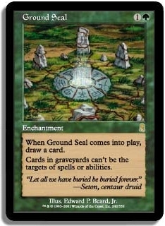When Ground Seal comes into play, draw a card. Cards in graveyards can't be the targets of spells or abilities.