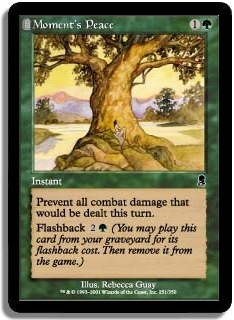 Prevent all combat damage that would be dealt this turn. Flashback 2G (You may play this card from your graveyard for its flashback cost. Then remove it from the game.)