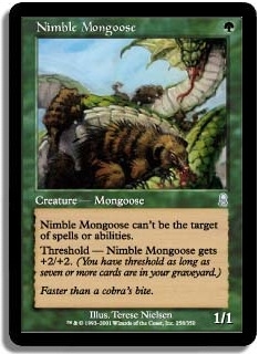 Nimble Mongoose can't be the target of spells or abilities. Threshold - Nimble Mongoose gets +2/+2. (You have threshold as long as seven or more cards are in your graveyard.)