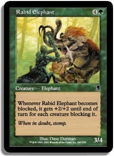 Whenever Rabid Elephant becomes blocked, it gets +2/+2 until end of turn for each creature blocking it.