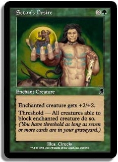 Enchanted creature gets +2/+2. Threshold - All creatures able to block enchanted creature do so. (You have threshold as long as seven or more cards are in your graveyard.)