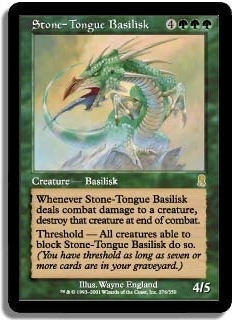 Whenever Stone-Tongue Basilisk deals combat damage to a creature, destroy that creature at end of combat. Threshold - All creatures able to block Stone-Tongue Basilisk do so. (You have threshold as long as seven or more cards are in your graveyard.)
