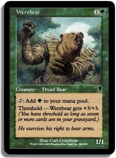T: Add G to your mana pool. Threshold - Werebear gets +3/+3. (You have threshold as long as seven or more cards are in your graveyard.)