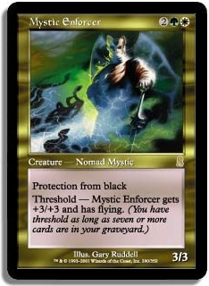 Protection from black Threshold - Mystic Enforcer gets +3/+3 and has flying. (You have threshold as long as seven or more cards are in your graveyard.)