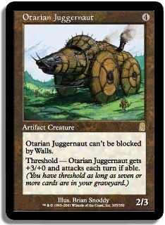Otarian Juggernaut can't be blocked by Walls. Threshold - Otarian Juggernaut gets +3/+0 and attacks each turn if able. (You have threshold as long as seven or more cards are in your graveyard.)