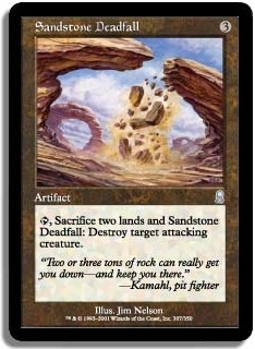 T, Sacrifice two lands and Sandstone Deadfall: Destroy target attacking creature.