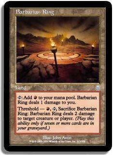 T: Add R to your mana pool. Barbarian Ring deals 1 damage to you. Threshold - R, T, Sacrifice Barbarian Ring: Barbarian Ring deals 2 damage to target creature or player. (Play this ability only if seven or more cards are in your graveyard.)