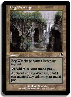 Bog Wreckage comes into play tapped. T: Add B to your mana pool. T, Sacrifice Bog Wreckage: Add one mana of any color to your mana pool.