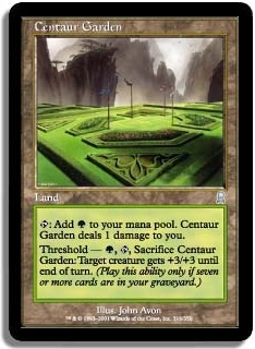 T: Add G to your mana pool. Centaur Garden deals 1 damage to you. Threshold - G, T, Sacrifice Centaur Garden: Target creature gets +3/+3 until end of turn. (Play this ability only if seven or more cards are in your graveyard.)
