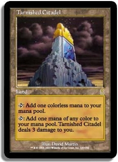 T: Add one colorless mana to your mana pool. T: Add one mana of any color to your mana pool. Tarnished Citadel deals 3 damage to you.
