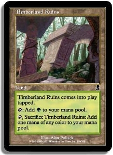 Timberland Ruins comes into play tapped. T: Add G to your mana pool. T, Sacrifice Timberland Ruins: Add one mana of any color to your mana pool.