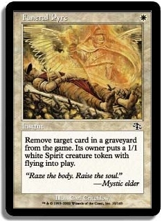 Remove target card in a graveyard from the game. Its owner puts a 1/1 white Spirit token with flying into play