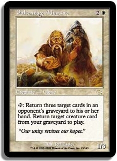 T: Return three target cards from an opponent?s graveyard to their hand. Return target creature card in your graveyard to play.