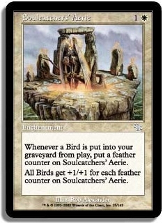 Whenever a Bird is put into a graveyard from play, put a feather counter on ~this~. All Birds get +1/+1 for each Feather counter on ~this~.