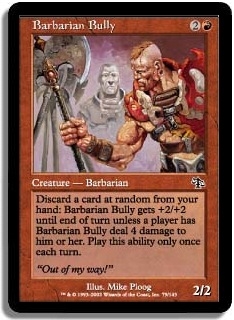 Discard a card at random from your hand. ~this~ gets +2/+2 until end of turn unless a player has ~this~ deal 4 damage to him or her. Play this ability only once each turn.