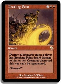 Destroy all creatures unless a player has Breaking Point deal 6 damage to him or her. Creatures destroyed this way can't be regenerated.