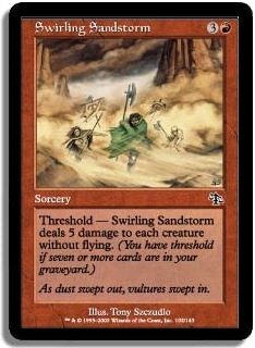 Threshold: ~this~ deals 5 damage to each creature without flying.