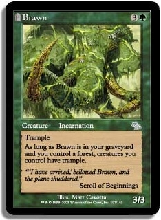As long as Brawn is in your graveyard and you control a Forest, creatures you control have trample