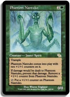 Phantom Nantuko comes into play with two +1/+1 counters on it. If damage would be dealt to Phantom Nantuko, prevent that damage. Remove a +1/+1 counter from Phantom Nantuko.