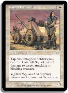 Tap two untapped Soldiers you control: Catapult Squad deals 2 damage to target attacking or blocking creature.
