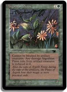 Cannot be blocked by artifact creatures. Any damage Argothian Pixies take from artifact creatures is reduced to 0.