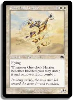 Whenever Gustcloak Harrier becomes blocked, you may untap it and remove it from combat.