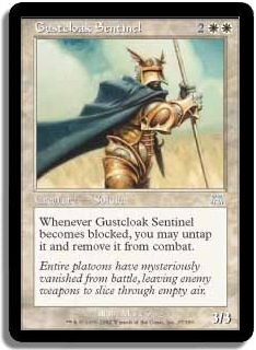 Whenever Gustcloak Sentinel becomes blocked, you may untap it and remove it from combat.