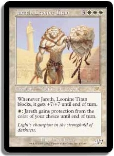 Whenever Jareth, Leonine Titan blocks, it gets +7/+7 until end of turn.