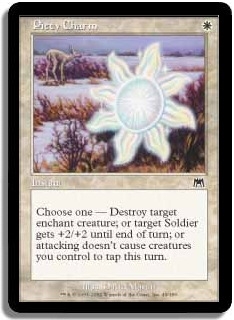 Choose one - Destroy target enchant creature; or target Soldier gets +2/+2 until end of turn; or attacking doesn?t cause creatures you control to tap this turn.