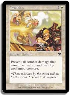 Prevent all combat damage that would be dealt to and dealt by enchanted creature.