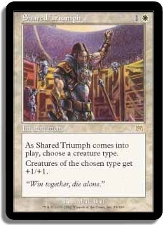 As Shared Triumph comes into play, choose a creature type. Creatures of the chosen type get +1/+1.