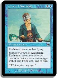 Sacrifice Crown of Ascension: Enchanted creature and other creatures that share a creature type with it gain flying until end of turn.