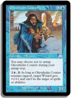 2U, T: As long as Ghosthelm Courier remains tapped, target Wizard gets +2/+2 and can't be the target of spells or abilities.