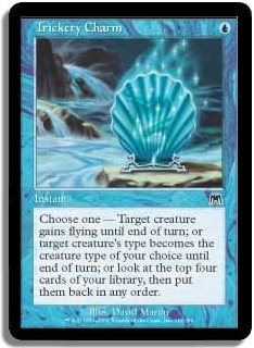 Choose one %97 Target creature gains flying until end of turn; or target creature's type becomes the creature type of your choice until end of turn; or look at the top four cards of your library, then put them back in any order.