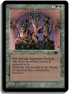 Any damage Argothian Treefolk take from an artifact source is reduced to 0.