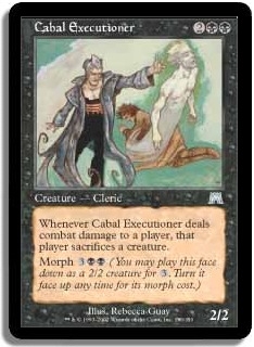 Whenever Cabal Executioner deals combat damage to a player, that player sacrifices a creature. Morph 3BB (You may play this face down as a 2/2 creature for 3. Turn it face up any time for its morph cost.)