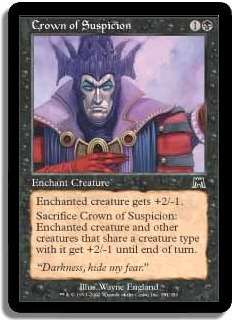 Sacrifice Crown of Suspicion: Enchanted creature and other creatures that share a creature type with it get +2/-1 until end of turn.