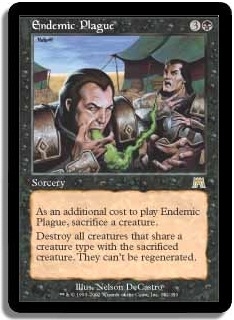 As an additional cost to play Endemic Plague, sacrifice a creature. Destroy all creatures that share a creature type with the sacrificed creature. They can't be regenerated.
