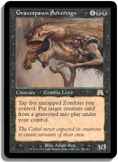 Tap five untapped Zombies you control: Put target creature card from a graveyard into play under your control.