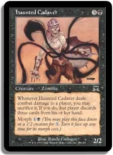 Whenever Haunted Cadaver deals combat damage to a player, you may sacrifice it. If you do, that player discards three cards from his or her hand.