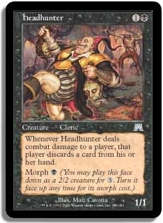 Whenever Headhunter deals combat damage to a player, that player discards a card from his or her hand. Morph B (You may play this face down as a 2/2 creature for 3. Turn it face up any time for its morph cost.)