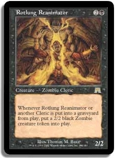 Whenever Rotlung Reanimator or another Cleric is put into a graveyard from play, put a 2/2 black Zombie creature token into play.