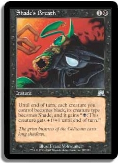 Until end of turn, each creature you control becomes black, its creature type becomes Shade, and it gains "B: This creature gets +1/+1 until end of turn."