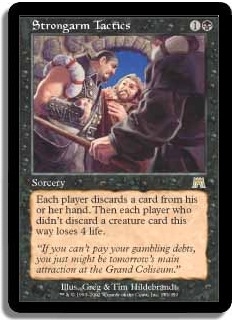 Each player discards a card from his or her hand. Then each player who didn't discard a creature card this way loses 4 life.